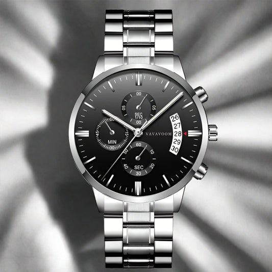 • Stylish VavaVoom Quartz Refined Steel Watch featuring a black dial, chronograph, and date function. Perfect for casual wear.