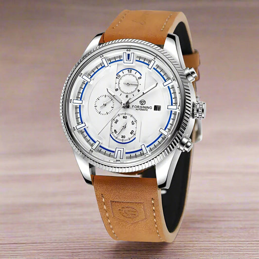 • Forsining Automatic Mechanical Watch features a stylish white dial with sporty blue accents and a durable leather strap.