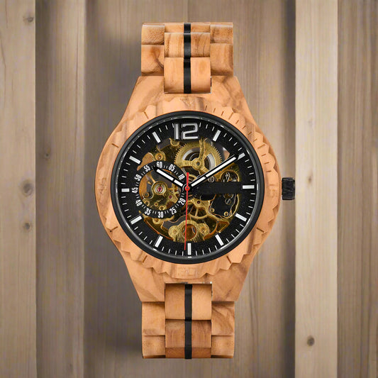 • Fully Automatic Wooden Mechanical Watch showcases intricate design and craftsmanship with a natural wood strap.